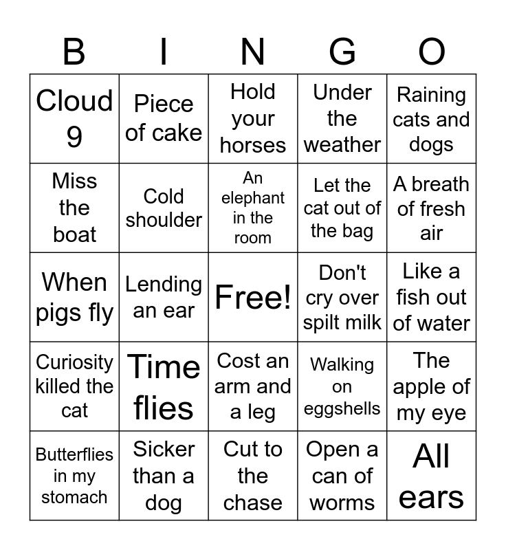 This bingo card has a free space and 24 words: Time flies, Sicker than a dog, An elephant in the room, Butterflies in my stomach, Raining cats and dogs, Cloud 9, Miss the boat, Piece of cake, Don't cry over spilt milk, Cost an arm and a leg, Let the cat out of the bag, When pigs fly, Walking on eggshells, The apple of my eye, Cold shoulder, Open a can of worms, Like a fish out of water, Hold your horses, A breath of fresh air, Lending an ear, All ears, Curiosity killed the cat, Under the weather and Cut to the chase.