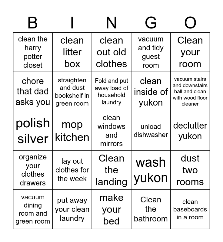 This bingo card has 26 words: Clean the landing, Clean the bathroom, Fold and put away load of household laundry, put away your clean laundry, Clean your room, clean the harry potter closet, chore that dad asks you, clean litter box, declutter yukon, wash yukon, clean inside of yukon, polish silver, dust two rooms, vacuum dining room and green room, mop kitchen, clean dining tables, vacuum and tidy guest room, organize your clothes drawers, clean out old clothes, clean windows and mirrors, vacuum stairs and downstairs hall and clean with wood floor cleaner, make your bed, unload dishwasher, lay out clothes for the week, straighten and dust bookshelf in green room and clean baseboards in a room.