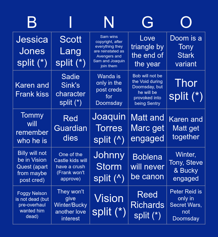 This bingo card has a free space and 24 words: One of the Castle kids will have a crush (Frank won't approve), They won't give Winter/Bucky another love interest, Wanda is only in the post creds for Doomsday, Foggy Nelson is not dead (but pre-overhaul wanted him dead), Doom is a Tony Stark variant, Jessica Jones split (*), Karen and Frank kiss, Scott Lang split (*), Matt and Marc get engaged, Johnny Storm split (^), Bob will not be the Void during Doomsday, but he will be provoked into being Sentry, Tommy will remember who he is, Boblena will never be canon, Winter, Tony, Steve & Bucky engaged, Sadie Sink's character split (*), Reed Richards split (*), Karen and Matt get together, Sam wins copyright, after everything they are reinstated as Avengers and Sam and Joaquin join them, Thor split (*), Red Guardian dies, Peter Reid is only in Secret Wars, not Doomsday, Billy will not be in Vision Quest (apart from maybe post cred), Love triangle by the end of the year and Vision split (*).