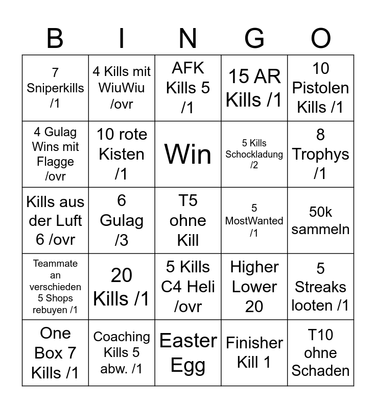 This bingo card has 25 words: 20 Kills /1, Easter Egg, Win, One Box 7 Kills /1, 10 Pistolen Kills /1, 7 Sniperkills /1, 4 Gulag Wins mit Flagge /ovr, 4 Kills mit WiuWiu /ovr, 5 MostWanted /1, 5 Kills C4 Heli /ovr, 5 Kills Schockladung /2, Kills aus der Luft 6 /ovr, Higher Lower 20, 5 Streaks looten /1, 10 rote Kisten /1, T10 ohne Schaden, 50k sammeln, AFK Kills 5 /1, 8 Trophys /1, 6 Gulag /3, T5 ohne Kill, Coaching Kills 5 abw. /1, Teammate an verschieden 5 Shops rebuyen /1, 15 AR Kills /1 and Finisher Kill 1.