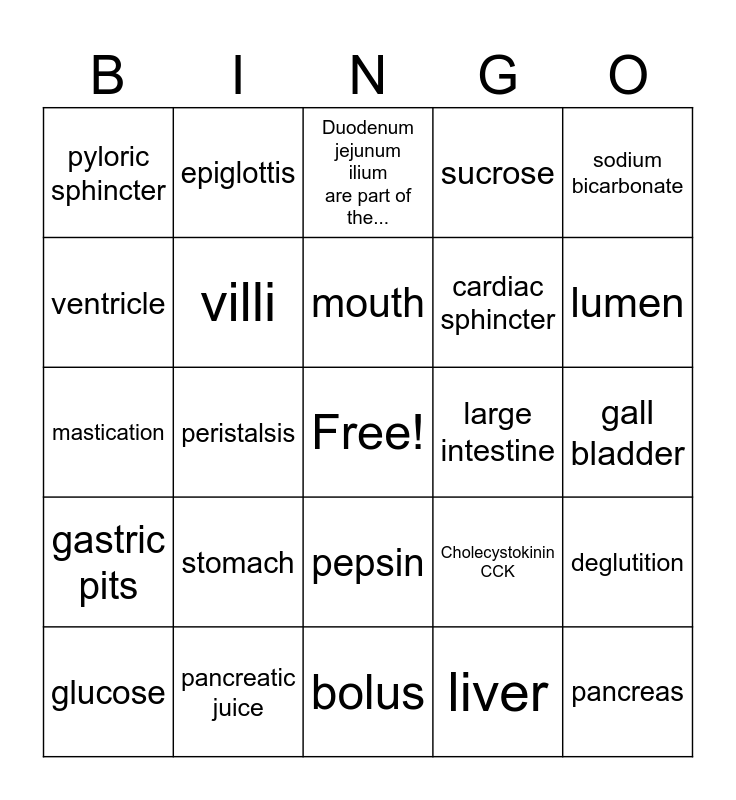 This bingo card has a free space and 31 words: bolus, esophagus, peristalsis, gastric juice, pyloric sphincter, Duodenum jejunum ilium are part of the..., villi, Cholecystokinin CCK, large intestine, liver, gall bladder, pancreas, lactose, polysaccharide, lumen, chyme, deglutition, stomach, gastric pits, pepsin, sodium bicarbonate, salivary amylase, glucose, epiglottis, cardiac sphincter, ventricle, sucrose, mastication, pancreatic juice, mouth and salivary glands.