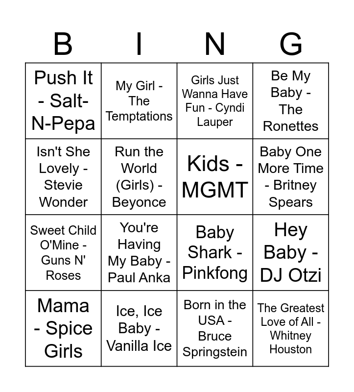 This bingo card has 25 words: Free!, Baby - Justin Bieber, Baby One More Time - Britney Spears, Always Be My Baby - Mariah Carey, Isn't She Lovely - Stevie Wonder, Push It - Salt-N-Pepa, Run the World (Girls) - Beyonce, My Girl - The Temptations, Ice, Ice Baby - Vanilla Ice, What A Girl Wants - Christina Aguilera, Sweet Child O'Mine - Guns N' Roses, Baby Shark - Pinkfong, Don't Worry Baby - Beach Boys, I Got You Babe - Sonny & Cher, Kids - MGMT, Born This Way - Lady Gaga, Born in the USA - Bruce Springstein, Girls Just Wanna Have Fun - Cyndi Lauper, You're Having My Baby - Paul Anka, Hey Baby - DJ Otzi, Mama - Spice Girls, Brown Eyed Girl - Van Morrison, The Greatest Love of All - Whitney Houston, Be My Baby - The Ronettes and Can't Get Enough Of You Baby - Smash Mouth.