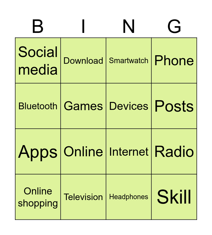 This bingo card has 16 words: Television, Radio, Smartwatch, Social media, Apps, Download, Internet, Headphones, Bluetooth, Games, Online shopping, Phone, Online, Posts, Devices and Skill.