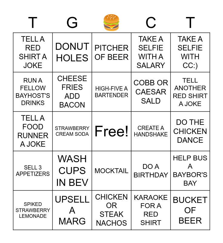 This bingo card has a free space and 24 words: WASH CUPS IN BEV, UPSELL A MARG, HIGH-FIVE A BARTENDER, SPIKED STRAWBERRY LEMONADE, TAKE A SELFIE WITH CC:), TELL A RED SHIRT A JOKE, RUN A FELLOW BAYHOST'S DRINKS, DONUT HOLES, CREATE A HANDSHAKE, MOCKTAIL, COBB OR CAESAR SALD, TELL A FOOD RUNNER A JOKE, DO A BIRTHDAY, HELP BUS A BAYBOR'S BAY, CHEESE FRIES ADD BACON, KARAOKE FOR A RED SHIRT, DO THE CHICKEN DANCE, PITCHER OF BEER, TELL ANOTHER RED SHIRT A JOKE, STRAWBERRY CREAM SODA, BUCKET OF BEER, SELL 3 APPETIZERS, TAKE A SELFIE WITH A SALARY and CHICKEN OR STEAK NACHOS.