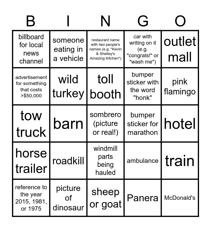 This bingo card has 139 words: camper/RV, person on their phone, red truck, cow, state flag, ambulance, water tower, dog in a car, church, airplane, duct-taped car part, bicycle, Free!, boat, kayak/canoe on top of car, billboard with children on it, gas station, sleeping passenger in another vehicle, person wearing sunglasses, hawk, road construction barrel, train, hospital sign, adopt-a-highway sign, purple car, barn, someone eating in a vehicle, stick figure family stickers, horse, car hauler, windmill, detour sign, personalized license plate, hotel, deer, river, school bus, railroad tracks, McDonald's, person wearing a hat, license plate with "Q", Walmart, pink flamingo, statue, cemetary, pond or lake, broken down/abandoned vehicle, state trooper, blue minivan, black MDX (not ours!), car with missing/broken side mirror, tow truck, toll booth, historical marker sign, Amazon truck, Costco, truck with food images on it, military vehicle, helicopter, bald eagle, Panera, yellow flower, person with feet up in vehicle (on dash/by window), billboard with ice cream on it, bird on water, baseball field, basketball hoop, car dealership, state park sign, roadkill, billboard for local news channel, construction worker, port-a-potty, bench, population sign, road sign with street name of food (e.g. "coffee rd.", "apple st."), fire truck, car with writing on it (e.g. "congrats!" or "wash me"), swing set, red roof, ladder, mailbox, sheep or goat, golf course, horse trailer, swimming pool, windmill parts being hauled, city name with at least two sets of double-letters, the word "yellowstone", picture of tiger or lion, sunflower, picture of dinosaur, sign for a museum, cat (a real one), outlet mall, graffiti, empty trailer, airport, rest area, fire hydrant, convertible, wild turkey, tunnel, umbrella, hay bale, Super Target, animal sculpture, pig, chef's hat (picture or real!), sombrero (picture or real!), the word "stink"/"stinky", restaurant name with two people's names (e.g. "Kevin & Shelley's Amazing Kitchen"), roller coaster, white picket fence, Santa Claus picture/decoration, bumper sticker for marathon, bumper sticker with the word "honk", picnic table, tennis court, cement mixer, temperature sign, bible quote, someone singing/dancing in the car, shirtless person, pigeon, tattoo, "honor student" bumper sticker/decal, kid in car seat, two people riding one motorcycle, limousine, animal crossing sign (but NOT for deer!), mattress, sign for Irish restaurant, advertisement for something that costs >$50,000, reference to the year 2015, 1981, or 1975, wavy inflatable air dancer, abandoned furniture on the side of the road, red-winged blackbird and temporary license plate.