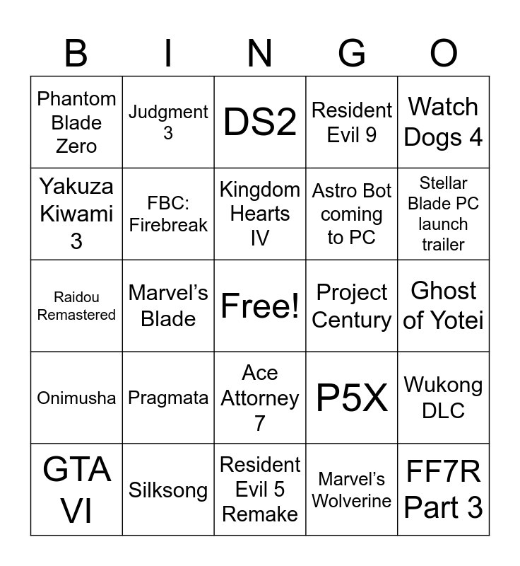 This bingo card has a free space and 24 words: Pragmata, Silksong, Kingdom Hearts IV, GTA VI, Watch Dogs 4, Phantom Blade Zero, Yakuza Kiwami 3, Judgment 3, Project Century, Ace Attorney 7, Astro Bot coming to PC, Raidou Remastered, P5X, Wukong DLC, FBC: Firebreak, Marvel’s Wolverine, Ghost of Yotei, DS2, Stellar Blade PC launch trailer, Marvel’s Blade, FF7R Part 3, Onimusha, Resident Evil 9 and Resident Evil 5 Remake.