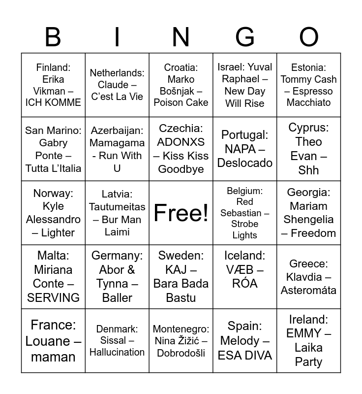 This bingo card has a free space and 36 words: Albania: Shkodra Elektronike – Zjerm, Armenia: PARG – SURVIVOR, Australia: Go-Jo – Milkshake Man, Azerbaijan: Mamagama - Run With U, Iceland: VÆB – RÓA, Malta: Miriana Conte – SERVING, Czechia: ADONXS – Kiss Kiss Goodbye, Luxembourg: Laura Thorn – La Poupée Monte Le Son, Estonia: Tommy Cash – Espresso Macchiato, Lithuania: Katarsis – Tavo Akys, Latvia: Tautumeitas – Bur Man Laimi, Israel: Yuval Raphael – New Day Will Rise, Italy: Lucio Corsi – Volevo Essere Un Duro, Belgium: Red Sebastian – Strobe Lights, Cyprus: Theo Evan – Shh, Finland: Erika Vikman – ICH KOMME, Austria: JJ – Wasted Love, Germany: Abor & Tynna – Baller, Ireland: EMMY – Laika Party, Croatia: Marko Bošnjak – Poison Cake, Georgia: Mariam Shengelia – Freedom, Greece: Klavdia – Asteromáta, Denmark: Sissal – Hallucination, France: Louane – maman, Montenegro: Nina Žižić – Dobrodošli, Netherlands: Claude – C’est La Vie, Norway: Kyle Alessandro – Lighter, Poland: Justyna Steczkowska – GAJA, Portugal: NAPA – Deslocado, San Marino: Gabry Ponte – Tutta L’Italia, Serbia: Princ – Mila, Slovenia: Klemen – How Much Time Do We Have Left, Spain: Melody – ESA DIVA, Sweden: KAJ – Bara Bada Bastu, Switzerland: Zoë Më – Voyage and Ukraine: Ziferblat – Bird of Pray.