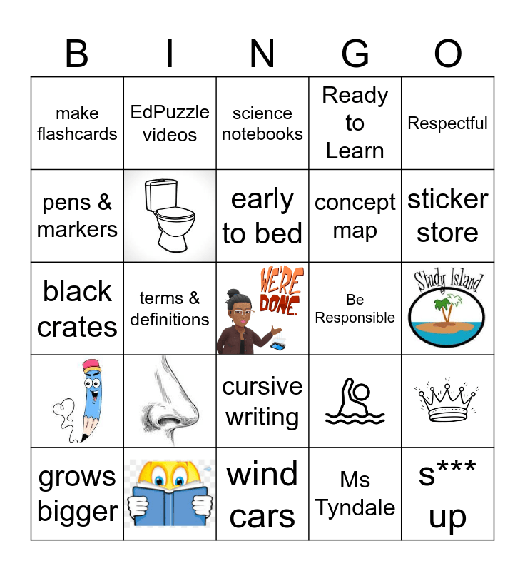 This bingo card has 7 images, a free space and 17 words: early to bed, grows bigger, Respectful, make flashcards, pens & markers, EdPuzzle videos, Be Responsible, cursive writing, concept map, black crates, Ms Tyndale, science notebooks, sticker store, terms & definitions, s*** up, Ready to Learn and wind cars.