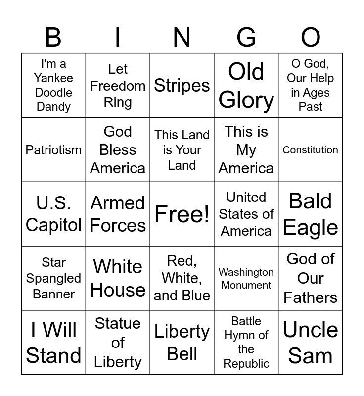 This bingo card has a free space and 34 words: God of Our Fathers, Battle Hymn of the Republic, America the Beautiful, America, Star Spangled Banner, God Bless America, O God, Our Help in Ages Past, I Will Stand, Let Freedom Ring, Stars, This Land is Your Land, Stripes, Fourth of July, I love America, United States of America, Constitution, Statue of Liberty, U.S. Capitol, White House, Washington Monument, Red, White, and Blue, Yankee Doodle, I'm a Yankee Doodle Dandy, Bald Eagle, Liberty Bell, Uncle Sam, Old Glory, Fireworks, This is My America, Patriotism, Democracy, Armed Forces, God of Our Fathers and God of Our Fathers.