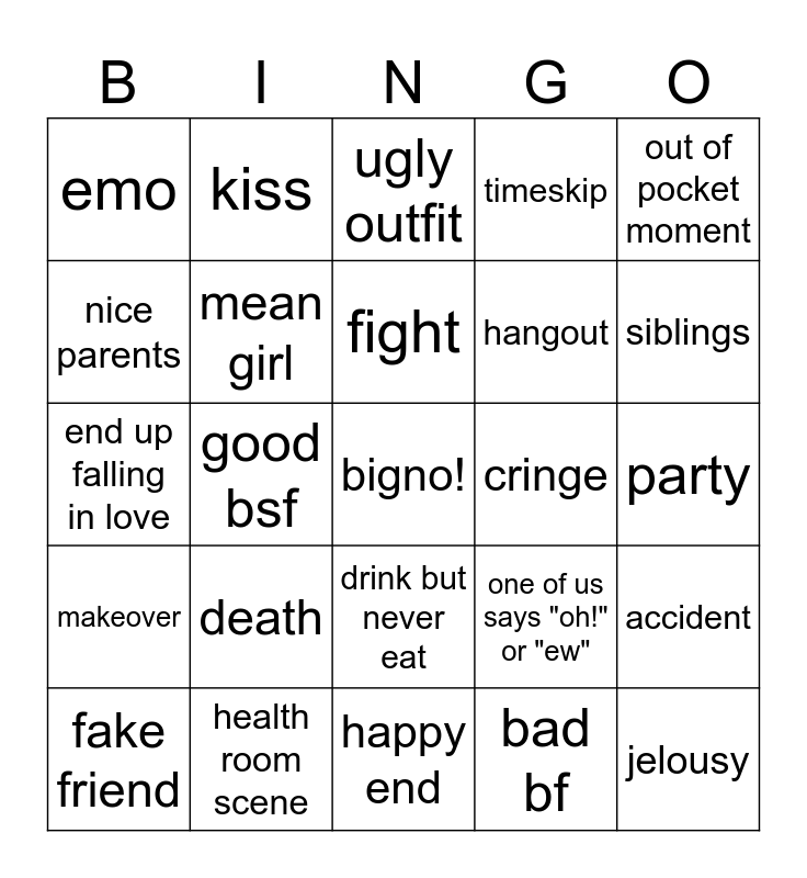 This bingo card has a free space and 24 words: death, health room scene, fight, fake friend, out of pocket moment, emo, nice parents, kiss, cringe, drink but never eat, hangout, end up falling in love, one of us says "oh!" or "ew", accident, mean girl, bad bf, party, ugly outfit, siblings, good bsf, jelousy, makeover, timeskip and happy end.