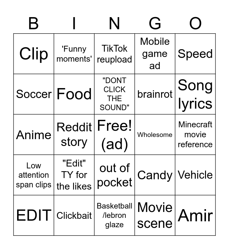 This bingo card has a free space and 24 words: "Edit" TY for the likes, Clickbait, "DONT CLICK THE SOUND", EDIT, Speed, Clip, Soccer, 'Funny moments', Wholesome, out of pocket, brainrot, Anime, Candy, Vehicle, Food, Movie scene, Minecraft movie reference, TikTok reupload, Song lyrics, Reddit story, Amir, Low attention span clips, Mobile game ad and Basketball /lebron glaze.