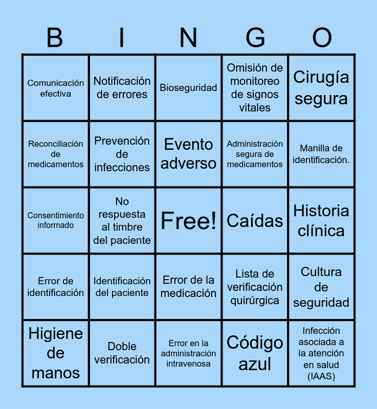 This bingo card has a free space and 24 words: Identificación del paciente, Doble verificación, Evento adverso, Higiene de manos, Cirugía segura, Comunicación efectiva, Reconciliación de medicamentos, Notificación de errores, Caídas, Error de la medicación, Administración segura de medicamentos, Consentimiento informado, Lista de verificación quirúrgica, Cultura de seguridad, Prevención de infecciones, Código azul, Historia clínica, Bioseguridad, Manilla de identificación., No respuesta al timbre del paciente, Infección asociada a la atención en salud (IAAS), Error de identificación, Omisión de monitoreo de signos vitales and Error en la administración intravenosa.
