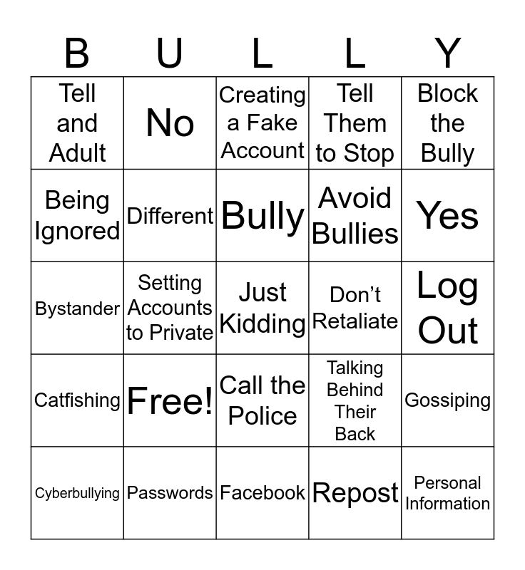 This bingo card has a free space and 25 words: Free!, Facebook, Bully, Cyberbullying, Block the Bully, Tell and Adult, Being Ignored, No, Don’t Retaliate, Call the Police, Avoid Bullies, Bystander, Talking Behind Their Back, Gossiping, Different, Home, Log Out, Creating a Fake Account, Yes, Setting Accounts to Private, Personal Information, Passwords, Catfishing, Tell Them to Stop and Repost.