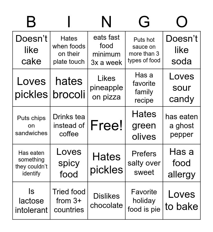 This bingo card has a free space and 24 words: Loves spicy food, Tried food from 3+ countries, Likes pineapple on pizza, Is lactose intolerant, Doesn’t like soda, Doesn’t like cake, Loves pickles, Hates when foods on their plate touch, Hates green olives, Hates pickles, Has a favorite family recipe, Puts chips on sandwiches, Prefers salty over sweet, Has a food allergy, hates brocoli, Favorite holiday food is pie, has eaten a ghost pepper, eats fast food minimum 3x a week, Loves sour candy, Drinks tea instead of coffee, Loves to bake, Has eaten something they couldn’t identify, Puts hot sauce on more than 3 types of food and Dislikes chocolate.