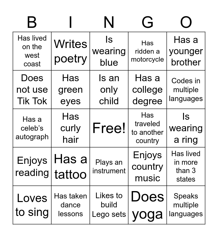 This bingo card has a free space and 39 words: Has a pet that is not a dog or cat, Was born the same month as you, Went to a movie theater this month, Has green eyes, Loves to sing, Plays an instrument, Is an only child, Enjoys playing sports, Has a younger brother, Enjoys reading, Has curly hair, Has ridden a motorcycle, Speaks multiple languages, Is wearing a ring, Has traveled to another country, Has a tattoo, Doesn’t drink coffee, Has lived on the west coast, Sleeps with the TV on, Enjoys country music, Does not use Tik Tok, Likes to build Lego sets, Has a college degree, Codes in multiple languages, Is left handed, Doesn’t like pickles, Worked here more than 5 years, Had braces, Likes to fish, Writes poetry, Likes to cook, Can whistle, Is wearing blue, Has taken dance lessons, Does yoga, Is a vegetarian, Has lived in more than 3 states, Has a celeb’s autograph and Favorite color is red.