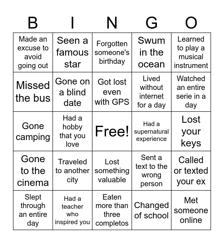This bingo card has a free space and 24 words: Traveled to another city, Had a teacher who inspired you, Got lost even with GPS, Slept through an entire day, Learned to play a musical instrument, Made an excuse to avoid going out, Missed the bus, Seen a famous star, Had a supernatural experience, Lost something valuable, Lived without internet for a day, Gone camping, Sent a text to the wrong person, Called or texted your ex, Gone on a blind date, Changed of school, Lost your keys, Forgotten someone's birthday, Watched an entire serie in a day, Had a hobby that you love, Met someone online, Gone to the cinema, Swum in the ocean and Eaten more than three completos.