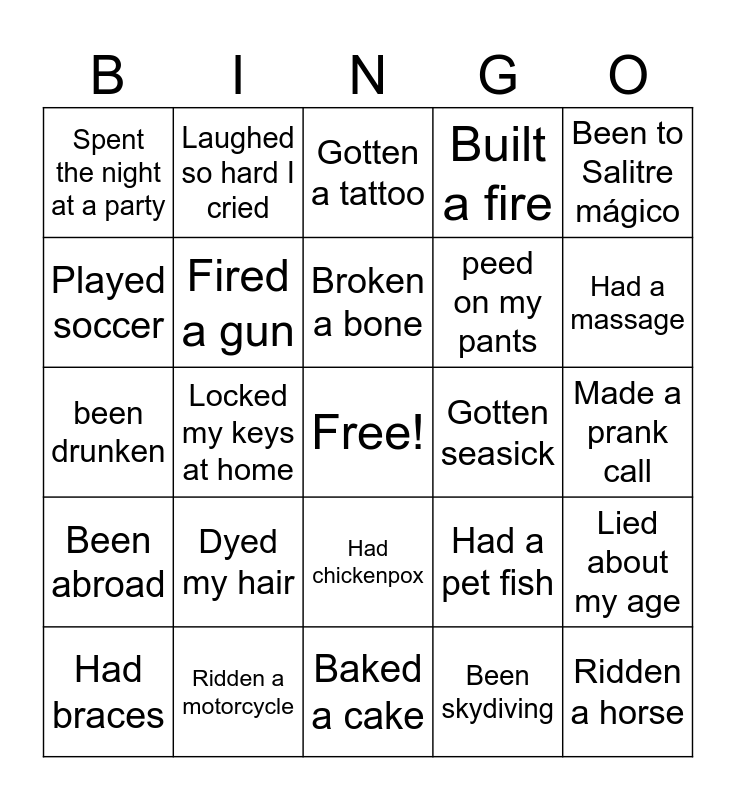 This bingo card has a free space and 25 words: Dyed my hair, Baked a cake, Broken a bone, Had braces, Been to Salitre mágico, Spent the night at a party, Played soccer, Laughed so hard I cried, Gotten seasick, Had chickenpox, peed on my pants, been drunken, Had a pet fish, Lied about my age, Fired a gun, Been ice skating, Made a prank call, Gotten a tattoo, Had a massage, Locked my keys at home, Ridden a horse, Ridden a motorcycle, Been abroad, Built a fire and Been skydiving.