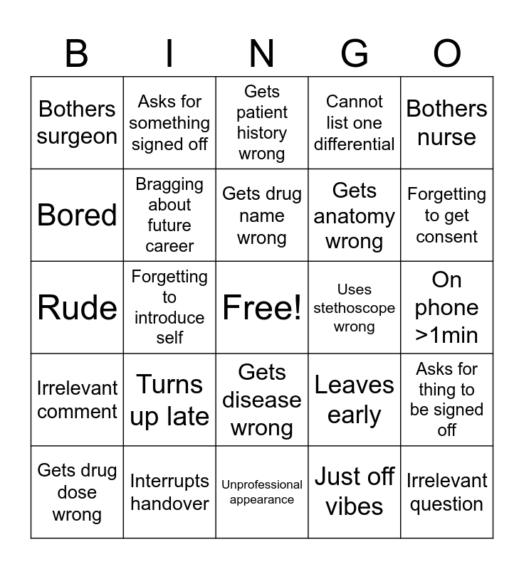 This bingo card has a free space and 24 words: Turns up late, Interrupts handover, Gets drug name wrong, Gets drug dose wrong, Bothers nurse, Bothers surgeon, Bored, Asks for something signed off, Uses stethoscope wrong, Gets disease wrong, Gets anatomy wrong, Rude, Leaves early, Asks for thing to be signed off, Bragging about future career, Just off vibes, On phone >1min, Gets patient history wrong, Forgetting to get consent, Forgetting to introduce self, Irrelevant question, Irrelevant comment, Cannot list one differential and Unprofessional appearance.