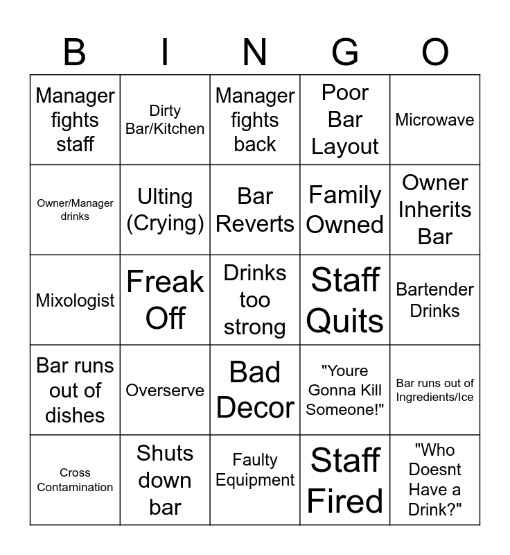 This bingo card has a free space and 24 words: Overserve, Shuts down bar, Bar Reverts, Cross Contamination, Microwave, Manager fights staff, Owner/Manager drinks, Dirty Bar/Kitchen, Staff Quits, Bad Decor, Family Owned, Mixologist, "Youre Gonna Kill Someone!", Bar runs out of Ingredients/Ice, Ulting (Crying), Staff Fired, Bartender Drinks, Manager fights back, Owner Inherits Bar, Freak Off, "Who Doesnt Have a Drink?", Bar runs out of dishes, Poor Bar Layout and Faulty Equipment.