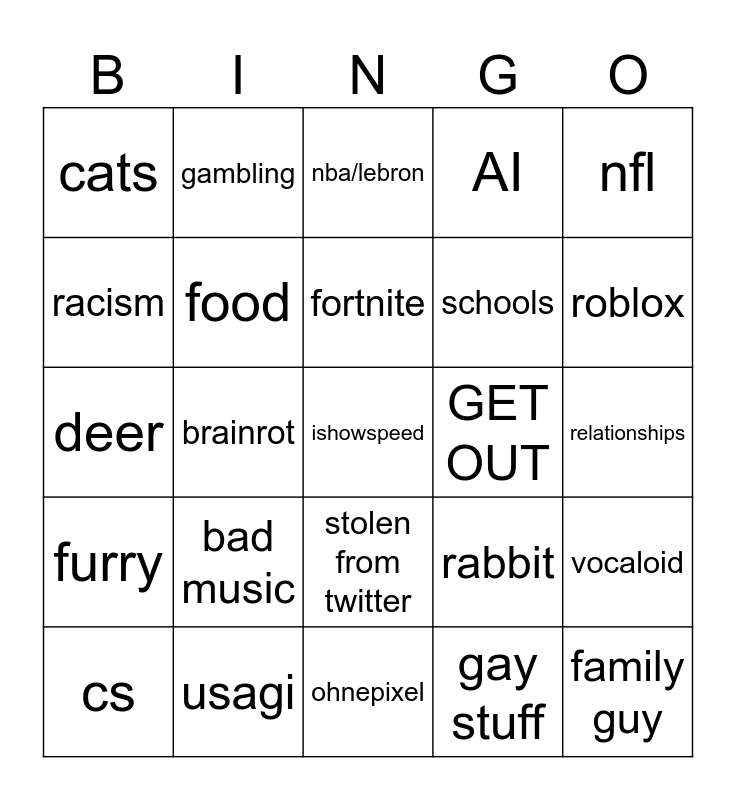 This bingo card has a free space and 24 words: bad music, usagi, fortnite, cs, nfl, cats, racism, gambling, GET OUT, stolen from twitter, schools, deer, rabbit, vocaloid, food, gay stuff, relationships, nba/lebron, roblox, brainrot, family guy, furry, AI and ohnepixel.