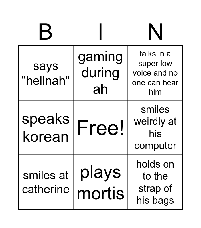This bingo card has a free space and 8 words: smiles weirdly at his computer, talks in a super low voice and no one can hear him, gaming during ah, smiles at catherine, says "hellnah", holds on to the strap of his bags, speaks korean and plays mortis.