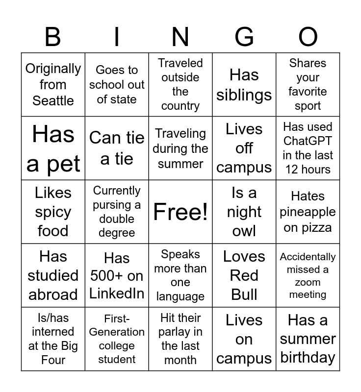 This bingo card has a free space and 24 words: Is/has interned at the Big Four, Has 500+ on LinkedIn, Traveling during the summer, Lives on campus, Shares your favorite sport, Originally from Seattle, Goes to school out of state, Traveled outside the country, Is a night owl, Hates pineapple on pizza, Likes spicy food, Can tie a tie, Loves Red Bull, Accidentally missed a zoom meeting, Has a pet, First-Generation college student, Hit their parlay in the last month, Has siblings, Has used ChatGPT in the last 12 hours, Has studied abroad, Currently pursing a double degree, Speaks more than one language, Lives off campus and Has a summer birthday.