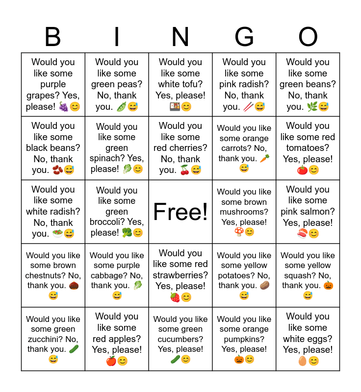 This bingo card has a free space and 30 words: Would you like some red apples? Yes, please! ππ, Would you like some yellow bananas? Yes, please! ππ, Would you like some green broccoli? Yes, please! π₯¦π, Would you like some orange tangerines? Yes, please! ππ, Would you like some purple grapes? Yes, please! ππ, Would you like some white tofu? Yes, please! π±π, Would you like some green spinach? Yes, please! π₯¬π, Would you like some red strawberries? Yes, please! ππ, Would you like some brown mushrooms? Yes, please! ππ, Would you like some green cucumbers? Yes, please! π₯π, Would you like some pink salmon? Yes, please! π£π, Would you like some white eggs? Yes, please! π₯π, Would you like some orange pumpkins? Yes, please! ππ, Would you like some green lettuce? Yes, please! π₯π, Would you like some red tomatoes? Yes, please! π π, Would you like some silver fish? No, thank you. ππ , Would you like some yellow potatoes? No, thank you. π₯π , Would you like some brown chestnuts? No, thank you. π°π , Would you like some purple cabbage? No, thank you. π₯¬π , Would you like some green beans? No, thank you. πΏπ , Would you like some white radish? No, thank you. π₯π , Would you like some red bell peppers? No, thank you. πΆοΈπ , Would you like some green peas? No, thank you. π«π , Would you like some orange carrots? No, thank you. π₯π , Would you like some black beans? No, thank you. π«π , Would you like some pink radish? No, thank you. π₯’π , Would you like some yellow squash? No, thank you. ππ , Would you like some green zucchini? No, thank you. π₯π , Would you like some red cherries? No, thank you. ππ and Would you like some white cauliflower? No, thank you. π₯¦π .
