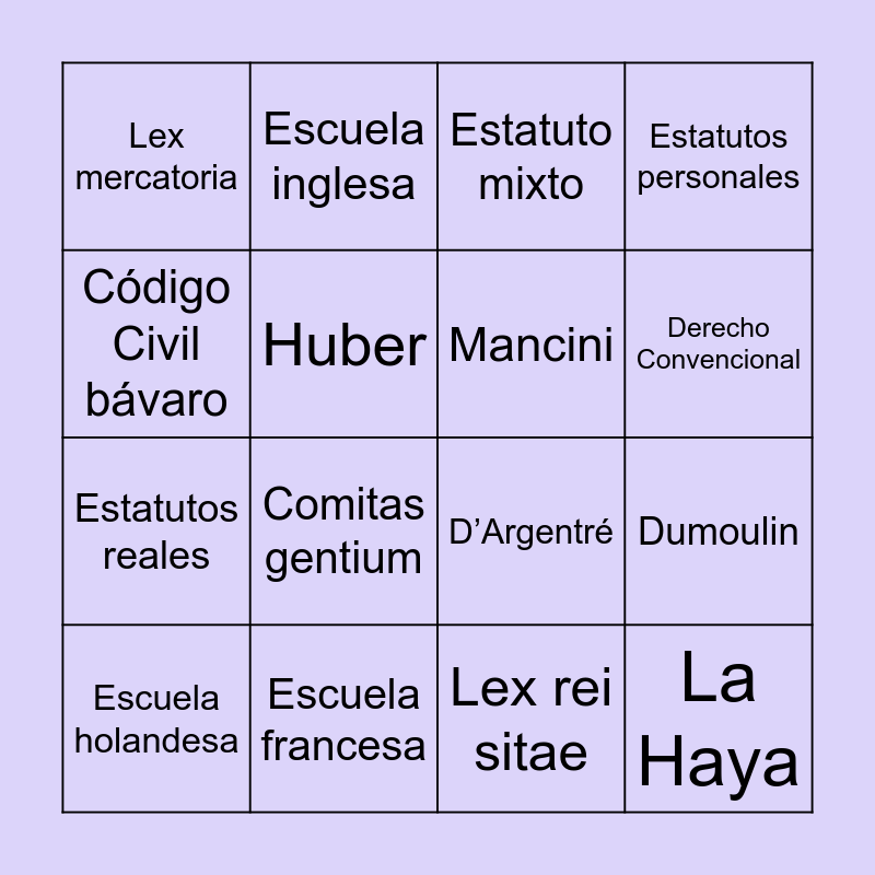 This bingo card has 16 words: Escuela francesa, Dumoulin, Estatuto mixto, Lex mercatoria, Estatutos reales, Escuela inglesa, D’Argentré, Lex rei sitae, Código Civil bávaro, Huber, Escuela holandesa, Estatutos personales, Comitas gentium, Derecho Convencional, Mancini and La Haya.