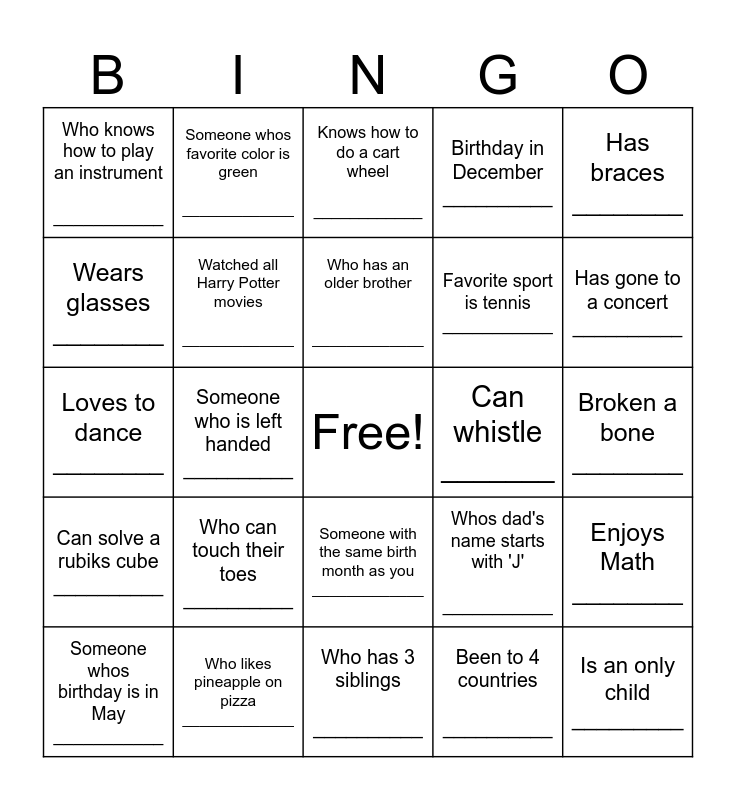 This bingo card has a free space and 24 words: Someone whos birthday is in May ___________, Who can touch their toes __________, Who has an older brother _____________, Been to 4 countries __________, Has braces ________, Who knows how to play an instrument ___________, Someone whos favorite color is green _____________, Knows how to do a cart wheel ____________, Can whistle _______, Broken a bone ________, Loves to dance ________, Watched all Harry Potter movies _____________, Whos dad's name starts with 'J' ___________, Enjoys Math ________, Wears glasses ________, Who likes pineapple on pizza _____________, Who has 3 siblings __________, Birthday in December __________, Has gone to a concert __________, Can solve a rubiks cube __________, Someone who is left handed __________, Someone with the same birth month as you _____________, Favorite sport is tennis ___________ and Is an only child _________.