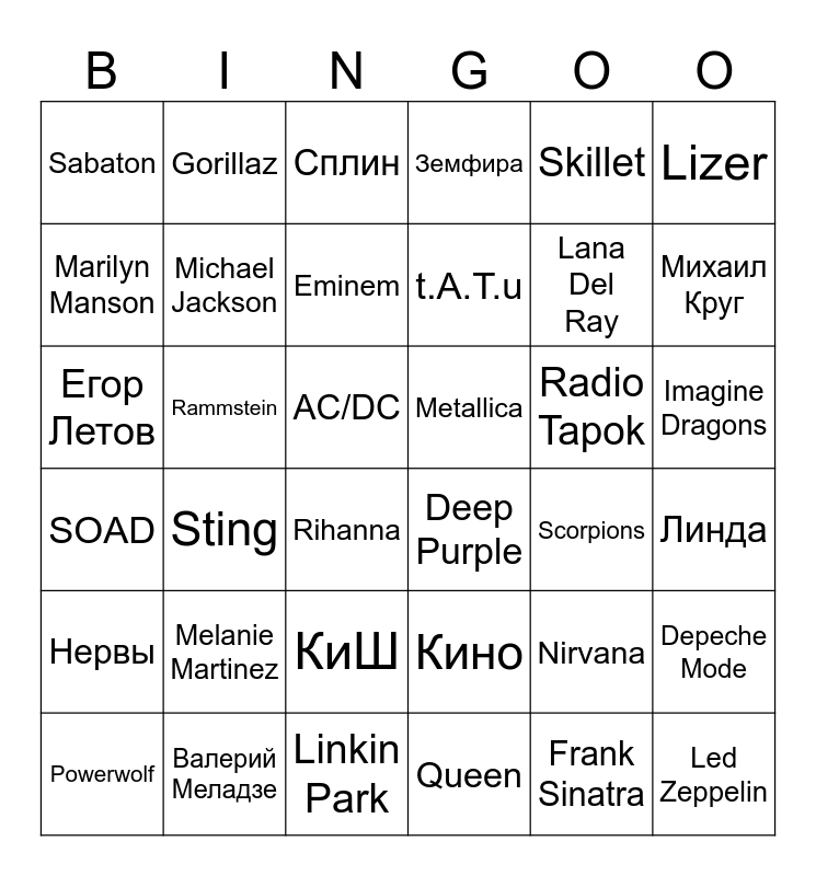 This bingo card has 36 words: Кино, КиШ, Queen, Marilyn Manson, SOAD, Metallica, Michael Jackson, Linkin Park, Skillet, Nirvana, Михаил Круг, Земфира, Depeche Mode, Rammstein, t.A.T.u, Sabaton, Нервы, Radio Tapok, Егор Летов, Сплин, AC/DC, Sting, Deep Purple, Rihanna, Scorpions, Gorillaz, Lana Del Ray, Валерий Меладзе, Eminem, Lizer, Led Zeppelin, Powerwolf, Линда, Imagine Dragons, Melanie Martinez and Frank Sinatra.