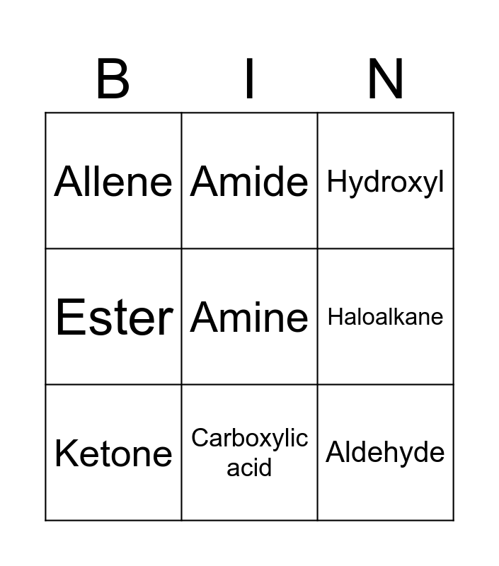 This bingo card has a free space and 11 words: Free!, Carboxylic acid, Aldehyde, Ketone, Amide, Hydroxyl, Haloalkane, Nitrile, Ester, Allene and Alkyne.