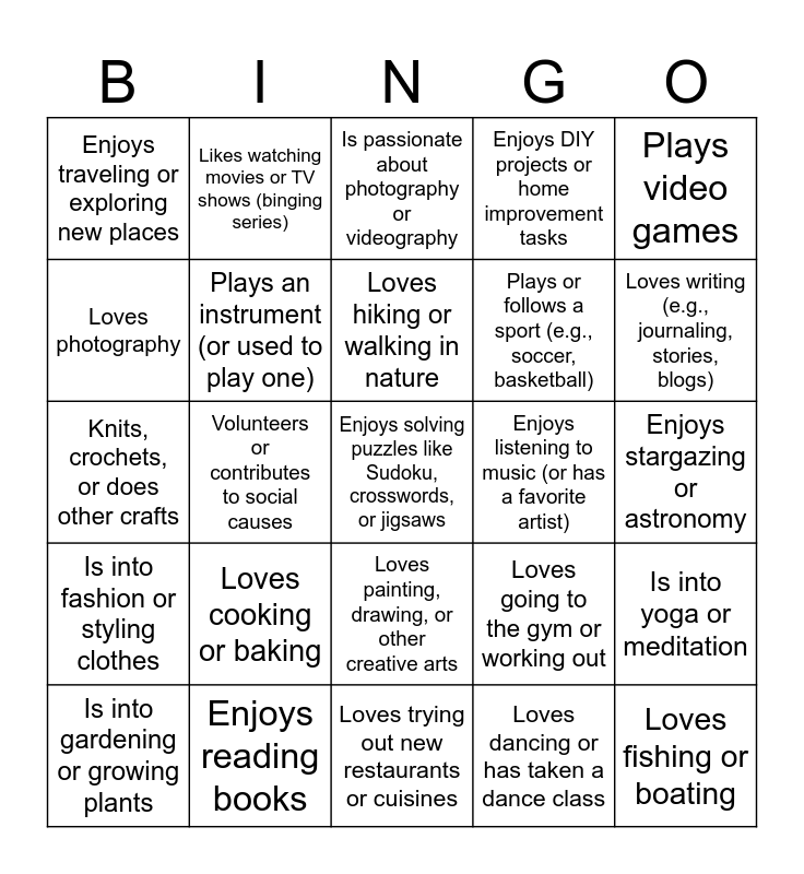 This bingo card has a free space and 24 words: Loves cooking or baking, Enjoys reading books, Loves hiking or walking in nature, Is into gardening or growing plants, Plays video games, Enjoys traveling or exploring new places, Loves photography, Likes watching movies or TV shows (binging series), Enjoys listening to music (or has a favorite artist), Loves painting, drawing, or other creative arts, Plays or follows a sport (e.g., soccer, basketball), Knits, crochets, or does other crafts, Loves going to the gym or working out, Is into yoga or meditation, Plays an instrument (or used to play one), Loves dancing or has taken a dance class, Enjoys stargazing or astronomy, Is passionate about photography or videography, Loves writing (e.g., journaling, stories, blogs), Volunteers or contributes to social causes, Loves fishing or boating, Is into fashion or styling clothes, Enjoys DIY projects or home improvement tasks and Loves trying out new restaurants or cuisines.
