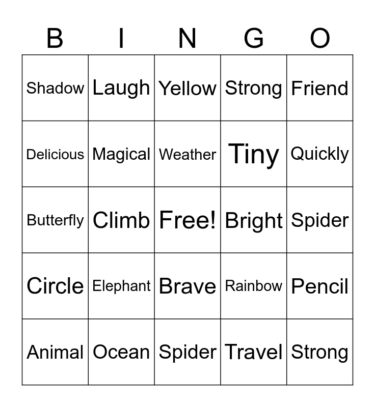 This bingo card has a free space and 24 words: Elephant, Ocean, Weather, Animal, Friend, Shadow, Delicious, Laugh, Bright, Brave, Tiny, Butterfly, Rainbow, Pencil, Magical, Travel, Spider, Yellow, Quickly, Climb, Strong, Circle, Strong and Spider.