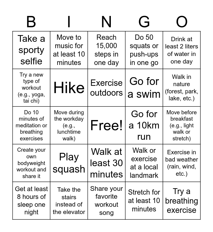 This bingo card has a free space and 26 words: Walk at least 30 minutes, Stretch for at least 10 minutes, Exercise outdoors, Take the stairs instead of the elevator, Drink at least 2 liters of water in one day, Take a sporty selfie, Try a new type of workout (e.g., yoga, tai chi), Move to music for at least 10 minutes, Move before breakfast (e.g., light walk or stretch), Walk or exercise at a local landmark, Go for a swim, Do 10 minutes of meditation or breathing exercises, Exercise in bad weather (rain, wind, etc.), Get at least 8 hours of sleep one night, Move during the workday (e.g., lunchtime walk), Walk a dog or help a friend/family member move, Do 50 squats or push-ups in one go, Create your own bodyweight workout and share it, Reach 15,000 steps in one day, Try a breathing exercise, Walk in nature (forest, park, lake, etc.), Share your favorite workout song, Go for a 10km run, Play squash, Hike and Play golf.