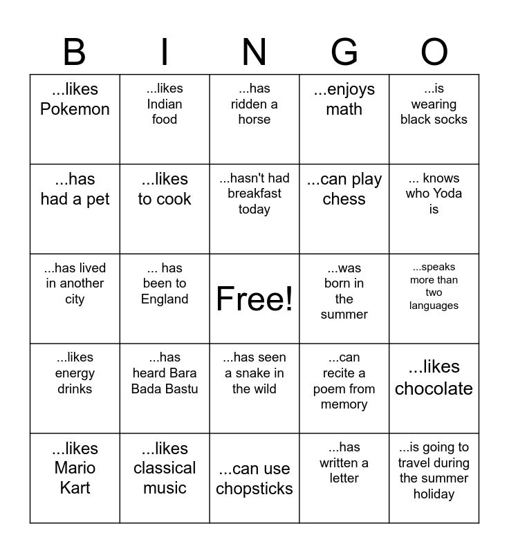 This bingo card has a free space and 24 words: ...has heard Bara Bada Bastu, ...likes classical music, ...hasn't had breakfast today, ...likes Mario Kart, ...is wearing black socks, ...likes Pokemon, ...has had a pet, ...likes Indian food, ...was born in the summer, ...has seen a snake in the wild, ...can play chess, ...has lived in another city, ...can recite a poem from memory, ...likes chocolate, ...likes to cook, ...has written a letter, ...speaks more than two languages, ...has ridden a horse, ... knows who Yoda is, ... has been to England, ...is going to travel during the summer holiday, ...likes energy drinks, ...enjoys math and ...can use chopsticks.