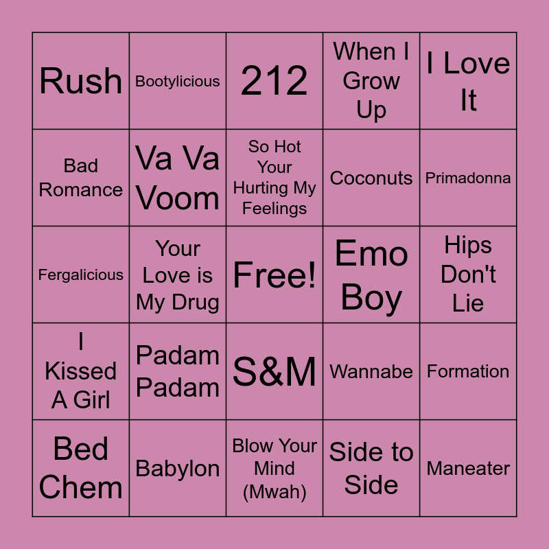 This bingo card has a free space and 30 words: Babylon, What Was That, Your Love is My Drug, Womanizer, Rush, 212, Va Va Voom, S&M, Emo Boy, Blow Your Mind (Mwah), Hips Don't Lie, Maneater, Side to Side, Good Luck, Babe, Primadonna, Rain on Me, Wannabe, I Kissed A Girl, Padam Padam, I Love It, Fergalicious, I Wanna Dance With Somebody, Bootylicious, Coconuts, Bad Romance, When I Grow Up, Formation, Bed Chem, So Hot Your Hurting My Feelings and Vogue.