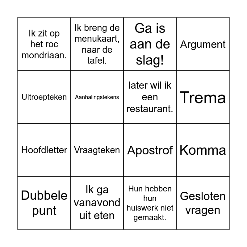 This bingo card has 21 words: Ik ga vanavond uit eten, 'Heeft u een keuze kunnen maken!', Ik breng de menukaart, naar de tafel., Het diner werdt afgelast., Hun hebben hun huiswerk niet gemaakt., later wil ik een restaurant., Ik zit op het roc mondriaan., Ga is aan de slag!, Apostrof, Trema, Hoofdletter, Argument, Gesloten vragen, Open vragen, Aanhalingstekens, Puntkomma, Dubbele punt, Vraagteken, Uitroepteken, Komma and Punt.