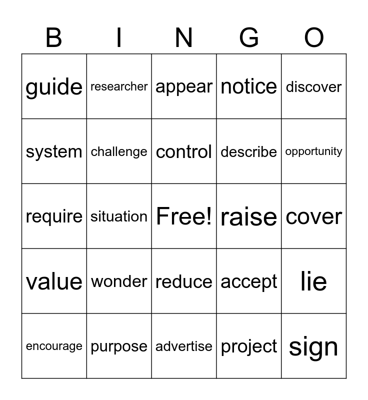 This bingo card has a free space and 26 words: reduce, project, control, purpose, discover, guide, system, researcher, cover, accept, describe, require, lie, encourage, situation, event, notice, value, appear, sign, opportunity, advertise, raise, wonder, challenge and benefit.