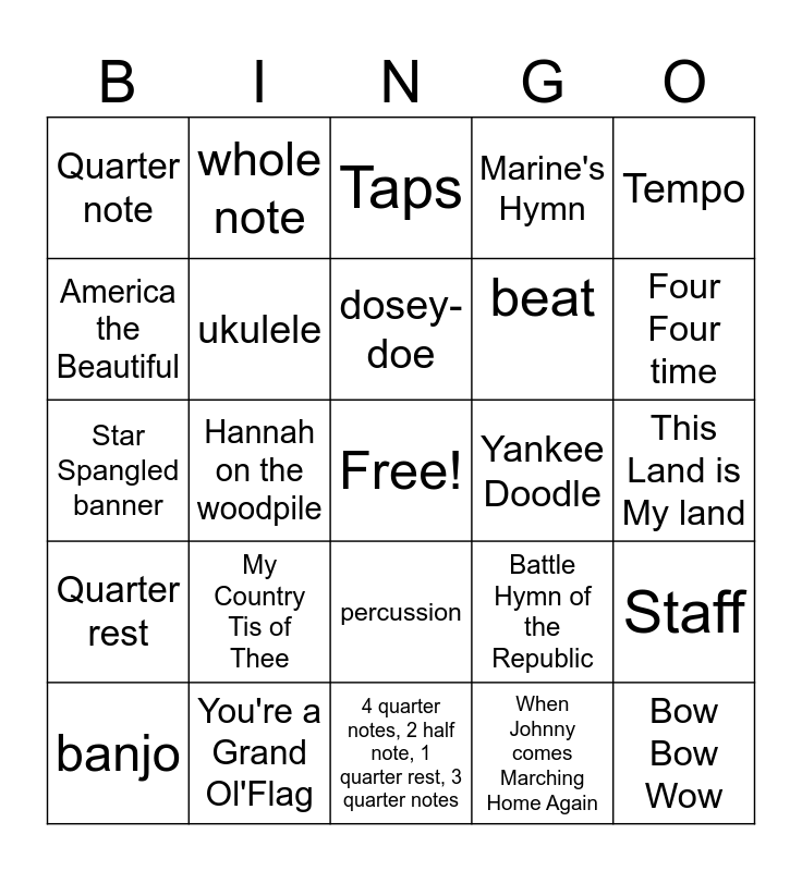 This bingo card has a free space and 24 words: My Country Tis of Thee, You're a Grand Ol'Flag, dosey-doe, banjo, Tempo, Quarter note, America the Beautiful, whole note, Yankee Doodle, percussion, beat, Star Spangled banner, Battle Hymn of the Republic, Staff, ukulele, When Johnny comes Marching Home Again, This Land is My land, Taps, Four Four time, Hannah on the woodpile, Bow Bow Wow, Quarter rest, Marine's Hymn and 4 quarter notes, 2 half note, 1 quarter rest, 3 quarter notes.