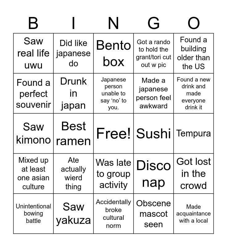 This bingo card has a free space and 24 words: Unintentional bowing battle, Ate actually wierd thing, Japanese person unable to say ‘no’ to you., Obscene mascot seen, Found a building older than the US, Saw real life uwu, Did like japanese do, Bento box, Sushi, Tempura, Saw kimono, Drunk in japan, Disco nap, Got lost in the crowd, Found a perfect souvenir, Saw yakuza, Accidentally broke cultural norm, Got a rando to hold the grant/tori cut out w pic, Found a new drink and made everyone drink it, Mixed up at least one asian culture, Best ramen, Was late to group activity, Made a japanese person feel awkward and Made acquaintance with a local.