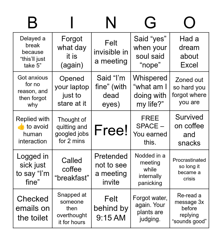 This bingo card has a free space and 25 words: Called coffee “breakfast”, Felt behind by 9:15 AM, Said “I’m fine” (with dead eyes), Checked emails on the toilet, Had a dream about Excel, Delayed a break because “this’ll just take 5”, Got anxious for no reason, and then forgot why, Forgot what day it is (again), FREE SPACE – You earned this., Pretended not to see a meeting invite, Whispered “what am I doing with my life?”, Replied with 👍 to avoid human interaction, Nodded in a meeting while internally panicking, Procrastinated so long it became a crisis, Opened your laptop just to stare at it, Cancelled plans to “rest” but just scrolled, Survived on coffee and snacks, Felt invisible in a meeting, Zoned out so hard you forgot where you are, Thought of quitting and googled jobs for 2 mins, Re-read a message 3x before replying “sounds good”, Snapped at someone then overthought it for hours, Logged in sick just to say “I’m fine”, Said “yes” when your soul said “nope” and Forgot water, again. Your plants are judging..