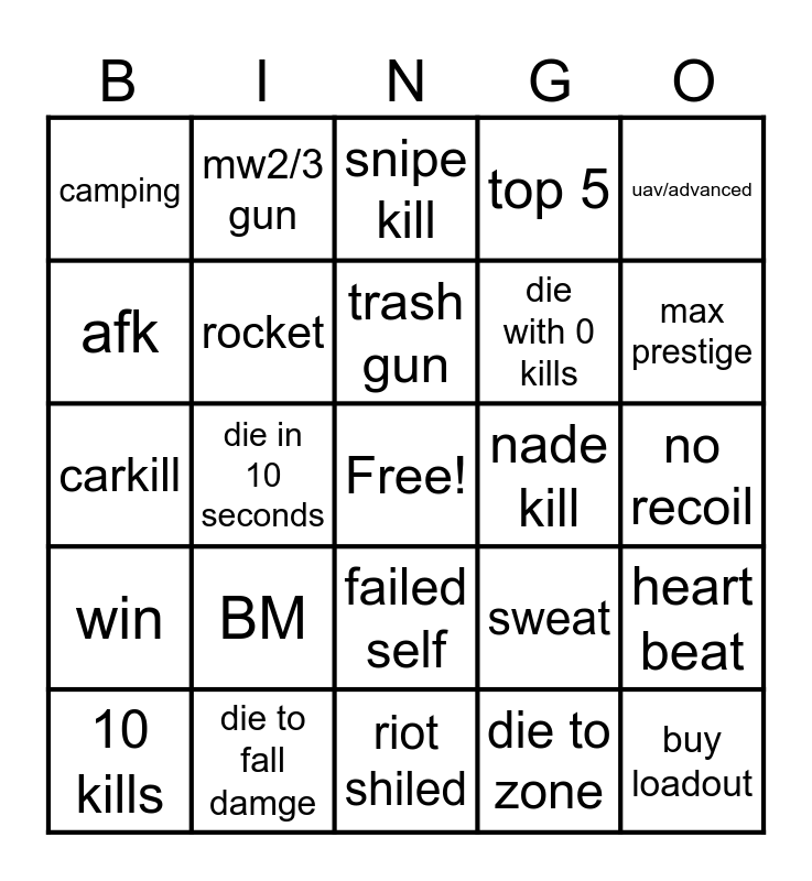 This bingo card has a free space and 24 words: BM, die to fall damge, trash gun, 10 kills, uav/advanced, camping, afk, mw2/3 gun, nade kill, failed self, die with 0 kills, carkill, sweat, heart beat, rocket, die to zone, no recoil, snipe kill, max prestige, die in 10 seconds, buy loadout, win, top 5 and riot shiled.