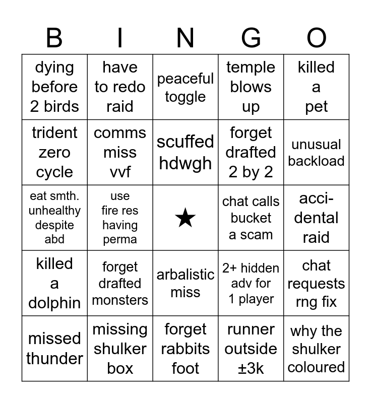 This bingo card has a free space and 24 words: forget drafted monsters, missing shulker box, scuffed hdwgh, missed thunder, killed a pet, dying before 2 birds, trident zero cycle, have to redo raid, chat calls bucket a scam, arbalistic miss, forget drafted 2 by 2, eat smth. unhealthy despite abd, 2+ hidden adv for 1 player, chat requests rng fix, comms miss vvf, runner outside ±3k, acci- dental raid, peaceful toggle, unusual backload, use fire res having perma, why the shulker coloured, killed a dolphin, temple blows up and forget rabbits foot.