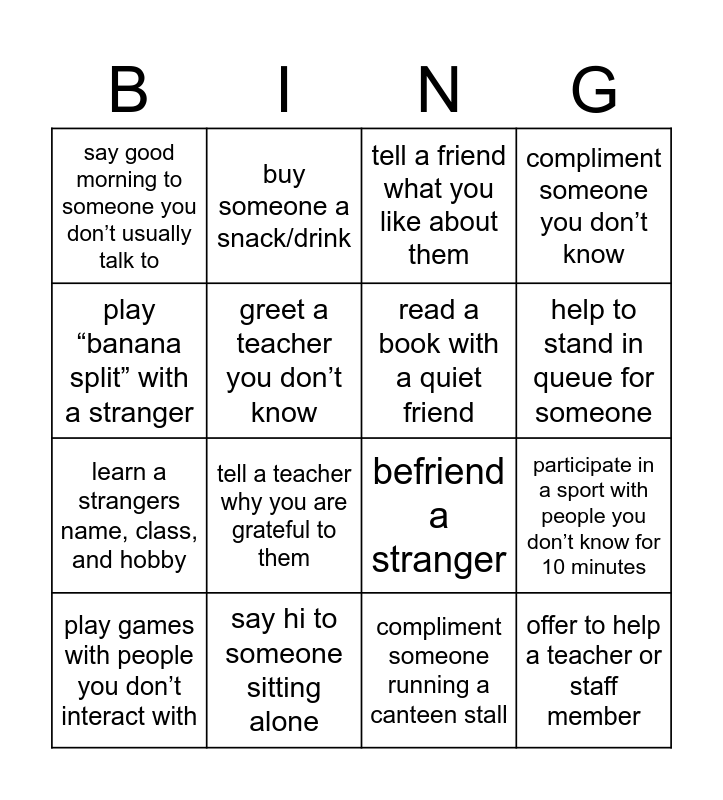 This bingo card has 16 words: say hi to someone sitting alone, participate in a sport with people you don’t know for 10 minutes, tell a friend what you like about them, say good morning to someone you don’t usually talk to, learn a strangers name, class, and hobby, buy someone a snack/drink, befriend a stranger, compliment someone running a canteen stall, play “banana split” with a stranger, greet a teacher you don’t know, play games with people you don’t interact with, compliment someone you don’t know, tell a teacher why you are grateful to them, help to stand in queue for someone, read a book with a quiet friend and offer to help a teacher or staff member.