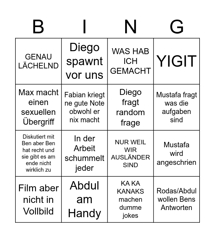This bingo card has 16 words: Abdul am Handy, Mustafa wird angeschrien, WAS HAB ICH GEMACHT, GENAU LÄCHELND, Diskutiert mit Ben aber Ben hat recht und sie gibt es am ende nicht wirklich zu, Diego spawnt vor uns, NUR WEIL WIR AUSLÄNDER SIND, KA KA KANAKS machen dumme jokes, Max macht einen sexuellen Übergriff, Fabian kriegt ne gute Note obwohl er nix macht, Film aber nicht in Vollbild, YIGIT, In der Arbeit schummelt jeder, Mustafa fragt was die aufgaben sind, Diego fragt random frage and Rodas/Abdul wollen Bens Antworten.