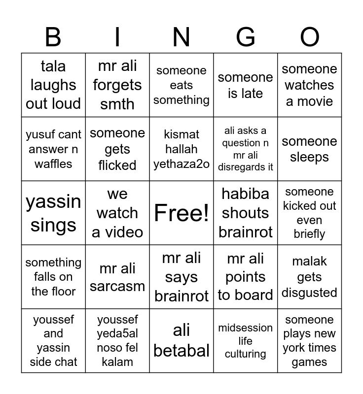 This bingo card has a free space and 24 words: mr ali sarcasm, youssef yeda5al noso fel kalam, kismat hallah yethaza2o, youssef and yassin side chat, someone watches a movie, tala laughs out loud, yusuf cant answer n waffles, mr ali forgets smth, habiba shouts brainrot, mr ali says brainrot, ali asks a question n mr ali disregards it, yassin sings, mr ali points to board, malak gets disgusted, someone gets flicked, midsession life culturing, someone kicked out even briefly, someone eats something, someone sleeps, we watch a video, someone plays new york times games, something falls on the floor, someone is late and ali betabal.