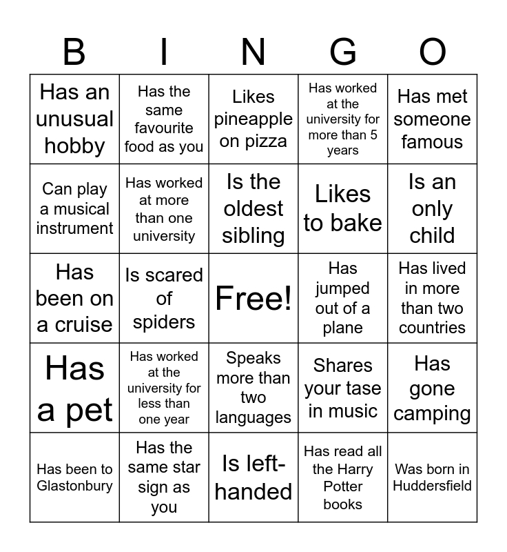 This bingo card has a free space and 24 words: Has worked at the university for less than one year, Has the same star sign as you, Is the oldest sibling, Has been to Glastonbury, Has met someone famous, Has an unusual hobby, Can play a musical instrument, Has the same favourite food as you, Has jumped out of a plane, Speaks more than two languages, Likes to bake, Has been on a cruise, Shares your tase in music, Has gone camping, Has worked at more than one university, Has read all the Harry Potter books, Has lived in more than two countries, Likes pineapple on pizza, Is an only child, Is scared of spiders, Was born in Huddersfield, Has a pet, Has worked at the university for more than 5 years and Is left-handed.
