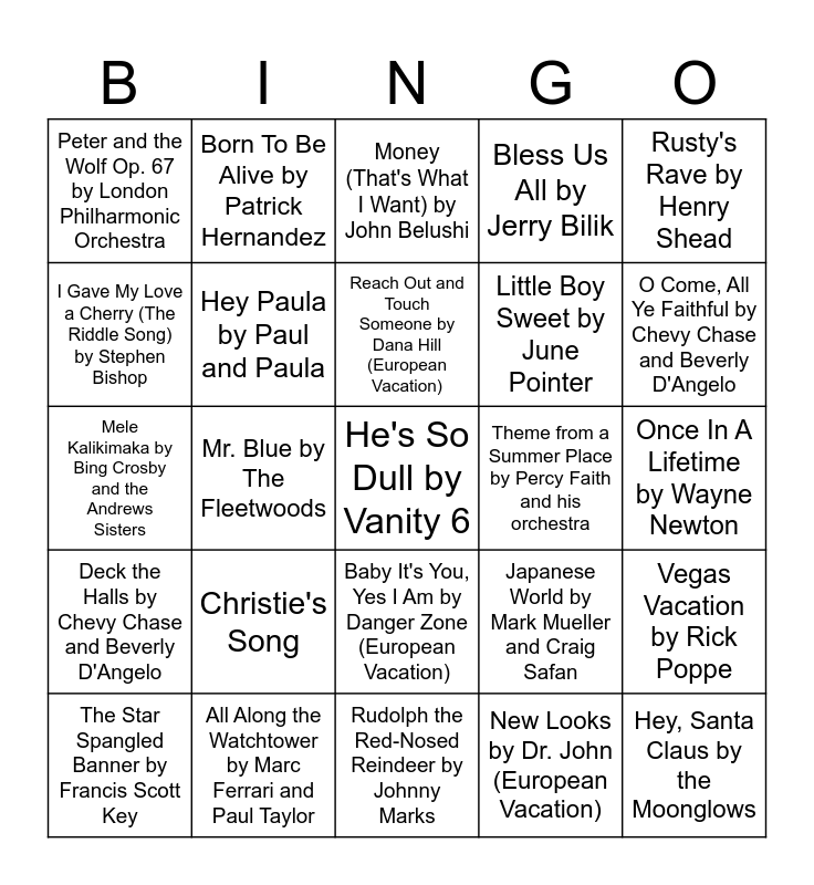 This bingo card has 83 words: Free!, Animal House by Stephen Bishop, Money (That's What I Want) by John Belushi, Dream Girl by Stephen Bishop, Shout by Lloyd Williams, Shama Lama Ding Dong by Lloyd Williams, Louie Louie by The Kingsmen, Tossin' and Turnin' by Bobby Lewis, Wonderful World by Same Cooke, Twistin' the Night Away by Sam Cooke, Let's Dance by Chris Montez, Who's Sorry Now by Connie Francis, Hey Paula by Paul and Paula, Theme from a Summer Place by Percy Faith and his orchestra, The Washington Post by John Philip Sousa, Peter and the Wolf Op. 67 by London Philharmonic Orchestra, The Star Spangled Banner by Francis Scott Key, I Gave My Love a Cherry (The Riddle Song) by Stephen Bishop, William Tell Overture by Gioachino Rossini, Holiday Road by Lindsey Buckingham, Dancin' 'corss the U.S.A. by Lindsey Buckingham, Little Boy Sweet by June Pointer, He's So Dull by Vanity 6, Blitzkrieg Bop by the Ramones, Mr. Blue by The Fleetwoods, I'm So Excited by the Pointer Sisters, Walley World National Anthem, Wiegenlied (Lullaby) Op. 49 No. 4, Chariots of Fire, Deep River Blues, Christie's Song, Christmas Vacation by Mavis Staples, That Spirit of Christmas by Ray Charles, Mele Kalikimaka by Bing Crosby and the Andrews Sisters, Hey, Santa Claus by the Moonglows, Here Comes Santa Claus by Gene Autry, Rudolph the Red-Nosed Reindeer by Johnny Marks, The Star-Spangled Banner by Griswolds, O Come, All Ye Faithful by Chevy Chase and Beverly D'Angelo, Deck the Halls by Chevy Chase and Beverly D'Angelo, We Wish You a Merry Christmas by Chevy Chase and Beverly D'Angelo, Silent Night, Hallelujah Chorus by George Frideric Handel, The 12 Days of Christmas by Perry Como, Good Vibrations by The Beach Boys, Garota De Ipanema by Stan Getz and Antonio Carlos Jobim, Born To Be Alive by Patrick Hernandez, Come Fly With Me by Frank Sinatra, The Arrival by Tom Bahler, Crystal Cage Part 2 by Tom Bahler and Chris Boardman, Japanese World by Mark Mueller and Craig Safan, Bless Us All by Jerry Bilik, Once In A Lifetime by Wayne Newton, Lovin' You by Wayne Newton and Beverly D'Angelo, Hey Girl by Frosted, Ready to Go (U.S. Mix) by Republica, Ain't That a Kick In the Head by Dean Martin, Man With the Golden Arm by Billy May and His Orchestra, All Along the Watchtower by Marc Ferrari and Paul Taylor, Fascination by Ruben Cabanas, Donald Therrien and Sasha Semenoff, Volare (Nel Blu, Dipinot Di Blu) by Nelson Riddle, Sabre Dance by Les Baxter and His Orchestra, The Way You Look Tonight by Gary Le Mel, Rusty's Rave by Henry Shead, My Love by Kellee, Vegas Vacation by Rick Poppe, Cold Hands Warm Heart by Marc Ferrari & Friends, Bad Medicine by God's Children, Some Like It Hot by Power Station (European Vacation), A Town Called Malice by The Jam (European Vacation), Problem's d'amour by Alexander Robotnick (European Vacation), C plane pour moi by Plastic Bertrand (European Vacation), Pig In a Poke by Danny Gould (European Vacation), Baby It's You, Yes I Am by Danger Zone (European Vacation), New Looks by Dr. John (European Vacation), Back in America by Network (European Vacation), Big Spender by Beverly D'Angelo (European Vacation), Reach Out and Touch Someone by Dana Hill (European Vacation), Schuhplattler by Traditional (European Vacation), Rule Britania by James Thomson and Thomas Augustine Arne (European Vacation), God Save the Queen by Anonymous (European Vacation), La Marseillaise by Claude Joseph Rouget de Lisle (European Vacation) and America the Beautiful by Katharine Lee Bates and Samuel A. Ward (European Vacation).