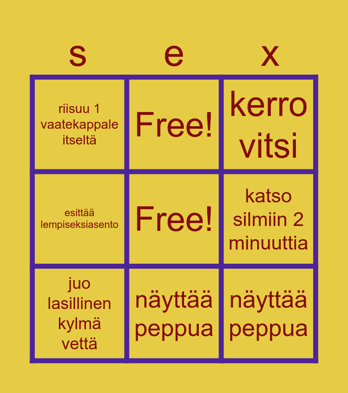 ⚠ This card has duplicate items: anna kielisuudelma (suostumuksella) (2), halaa kaveria (2), riisuu 1 vaatekappale itseltä (2), kerro vitsi (2), juo lasillinen kylmä vettä (2), näyttää peppua (2)