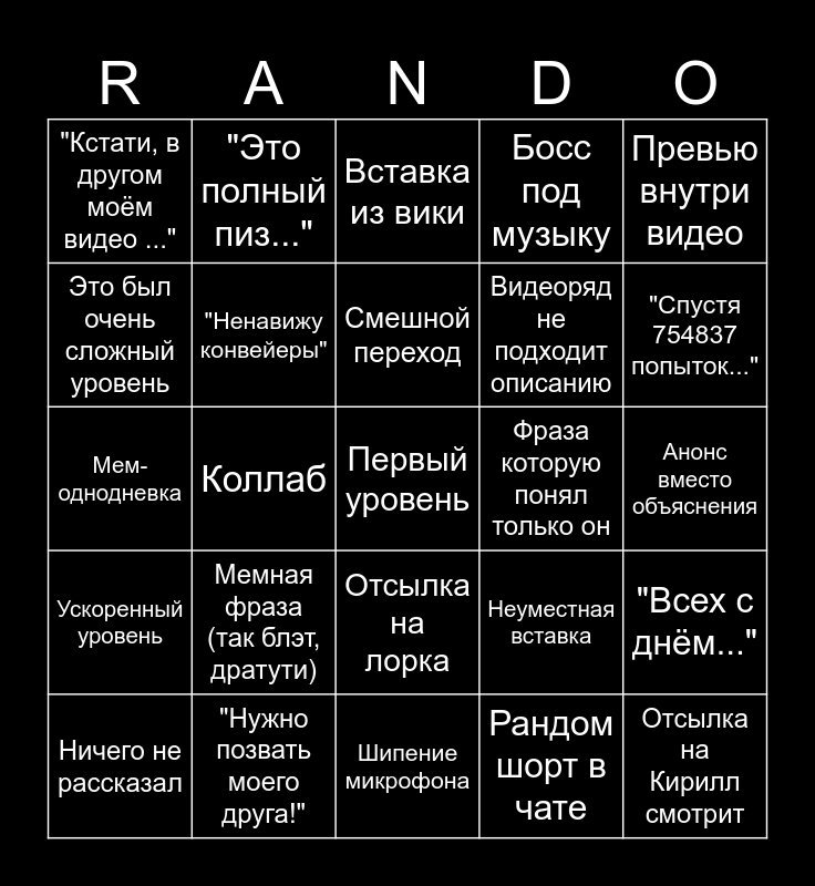 This bingo card has a free space and 39 words: Мем вместо объяснения, Всеееем хало, "Это отсылка на...", "Ненавижу конвейеры", Ничего не рассказал, Отсылка на лорка, Смешной переход, Музыка с вокалом, Превью внутри видео, Ускоренный уровень, Коллаб, Босс под музыку, Отсылка на Кирилл смотрит, Анонс вместо объяснения, Фраза которую понял только он, Мемная фраза (так блэт, дратути), Фрагмент из ирл, "Кстати, в другом моём видео ...", "Если это видео наберёт...", Неуместная вставка, Это был очень сложный уровень, Шипение микрофона, Видеоряд не подходит описанию, "Спустя 754837 попыток...", Разделение на главы, Смешной саундтрек, "Ностальгия", Editing mistake, Выдуманный язык, "Это полный пиз...", Отдельное спасибо эдгару галимову, Вставка со старым видосом, Вставка из вики, "Нужно позвать моего друга!", Рандом шорт в чате, Отсылка крылышки кфс, "Всех с днём...", Мем-однодневка and Локальный мем который поняли 2 человека.